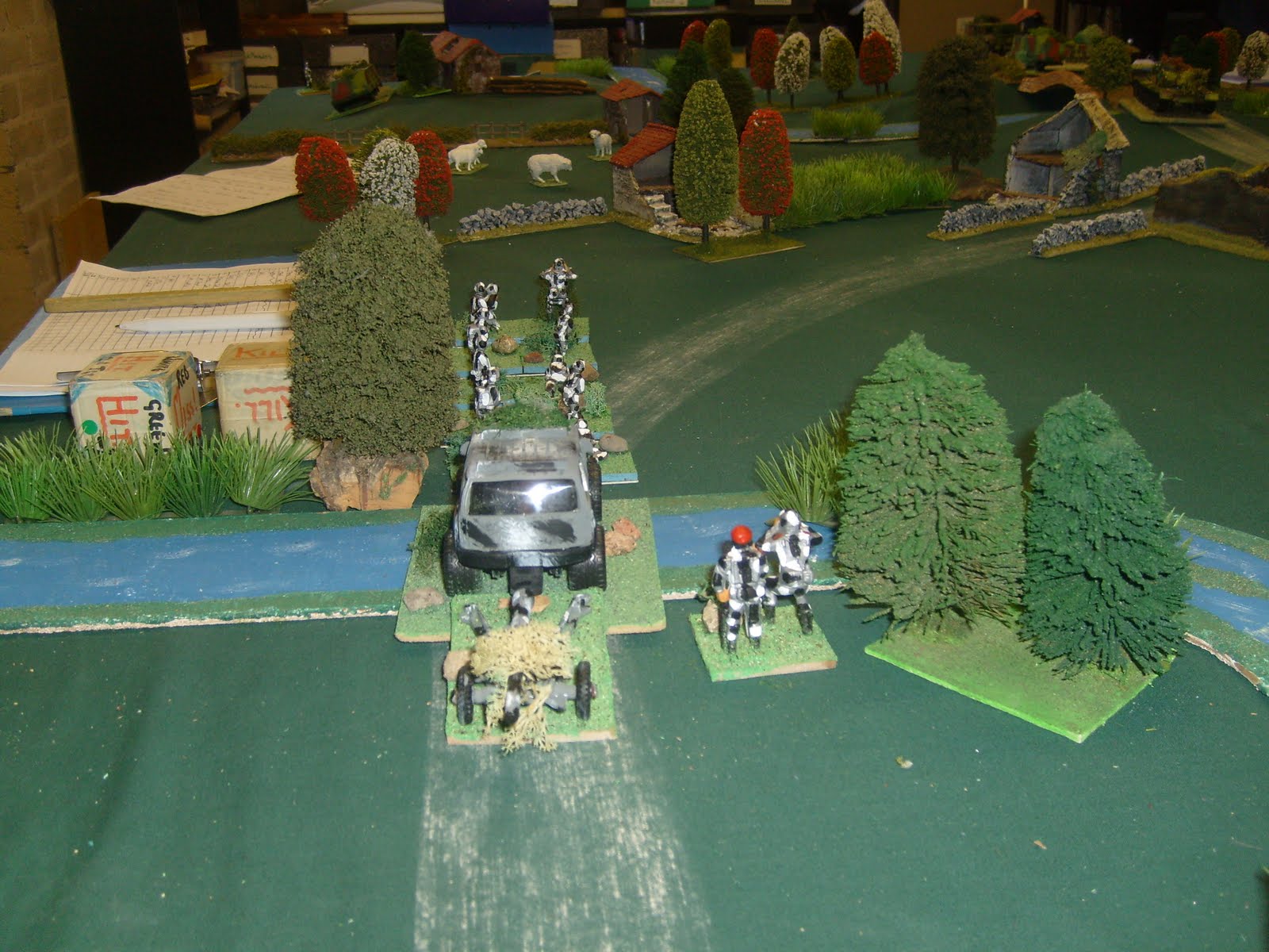 The game involved the advance along the length of the board by David and Graham's troops. They had mechanised columns with some air support and were restricted by terrain to using only the bridges for the heavy armour. The terrain was rolling and a village dominated the exit from the first bridge, situated on the ridge above the river.
