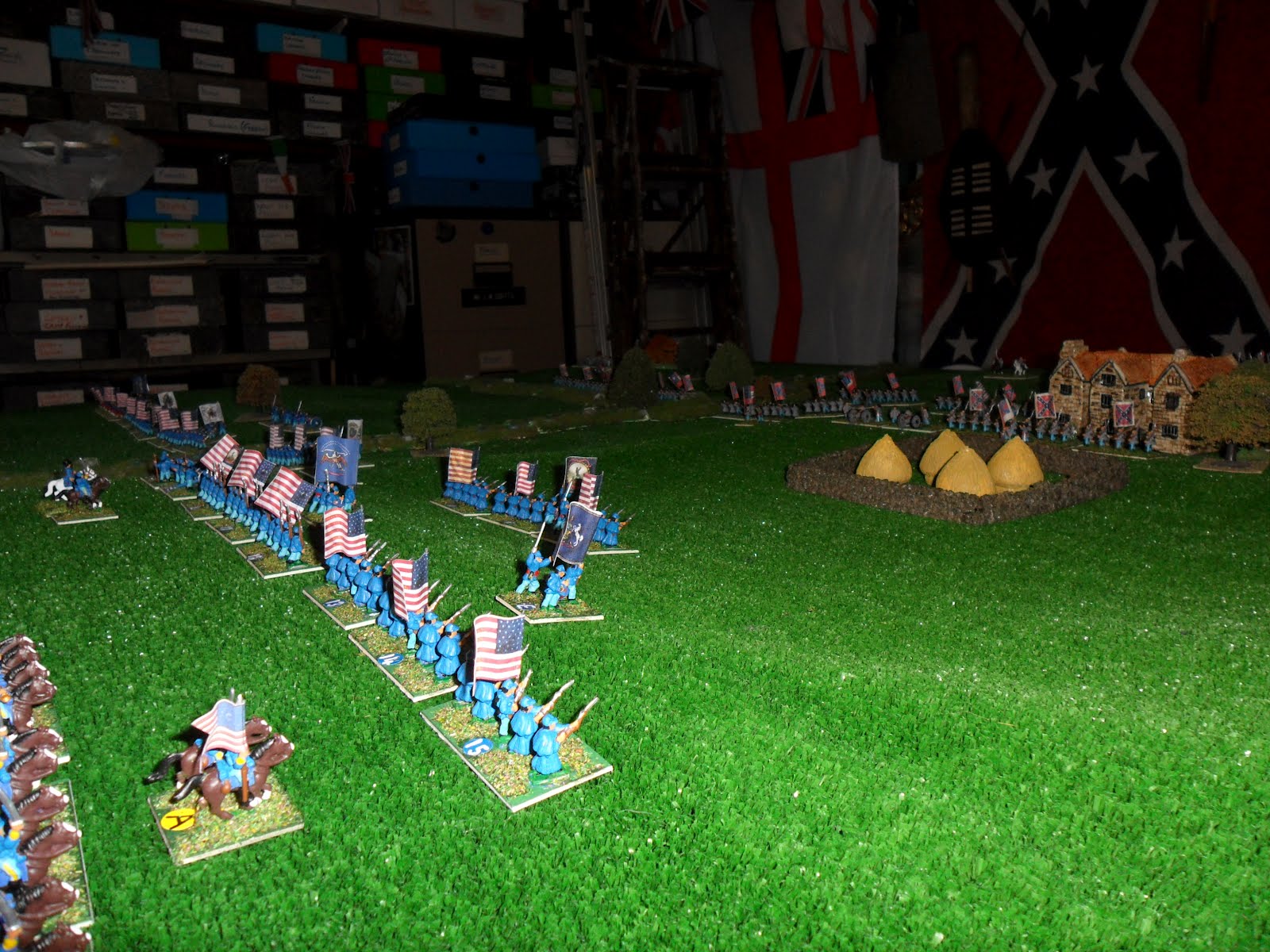 These are Dave's troops defending "tower hill",they stood for a cou[ple of moves then Dave very wisely took them back towards the trees, because of the threat to them by art. and rifle fire,they did mount a bit of a counter attack which stopped me for a while but this was my only success in the game,and after being fired on and threatened by cav. I decided that enough was enough and I ended the game still holding the hill but nothing else!!