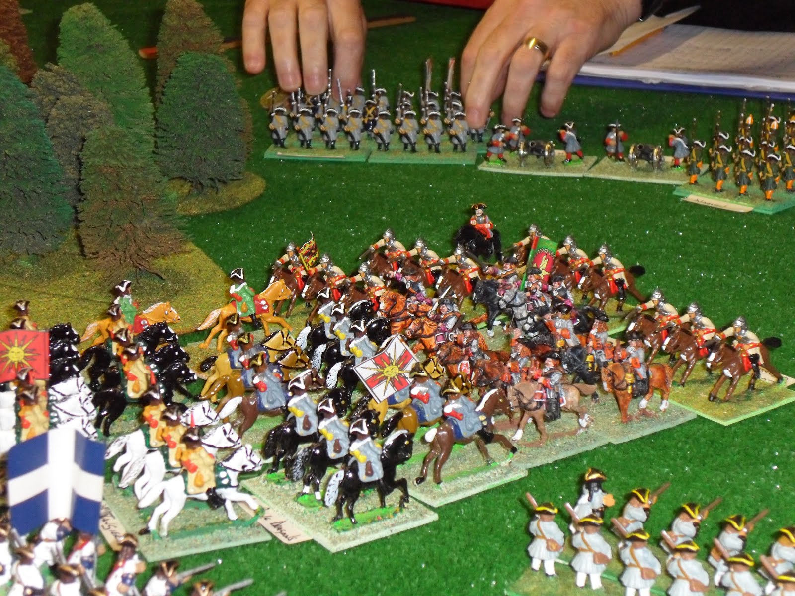 The cavalry melee,first stage,the melee swung both ways, and I'm sure that both Paul and myself were confident ,that,if we put a couple of extra squadrons each into the fray,we would win,in the end the Allies won and my centre was deemed untenable,however the town was yet to be taken,which was the whole objective of the game!