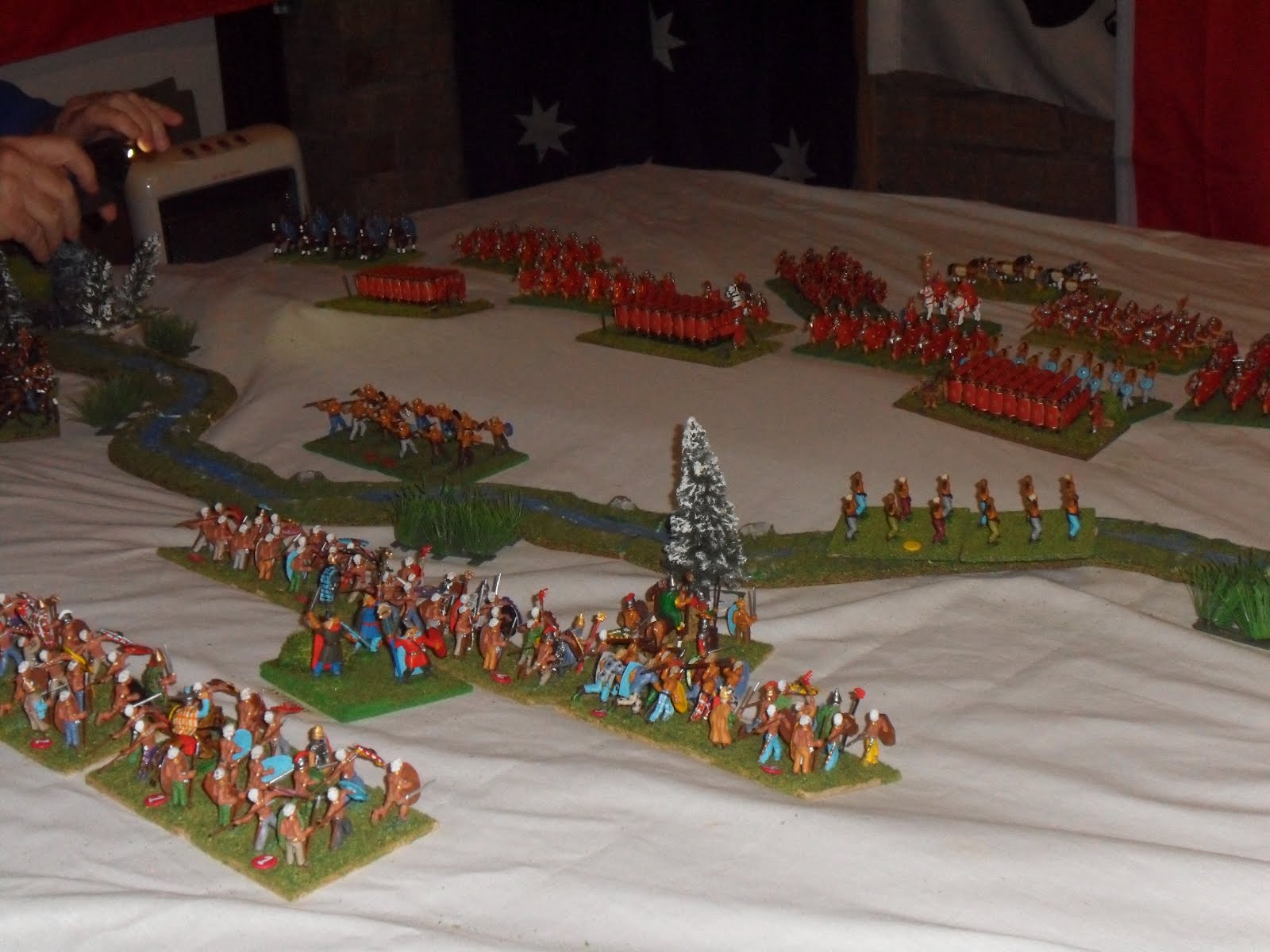 This photo shows Dave's attack across the stream with two lines of inf. supported by cavalry and guns,it was to prove an attack too many however,as he was eventually thrown back by "dogged" Russian infantry,and a well placed shot from Brian's gun battery.