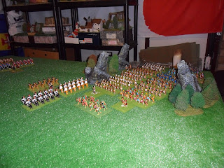 This photo shows Paul's force in the pass,he had 11 units of good hoplites,a couple of cavalry units and two archer units.Paul's plan was to use the outside column to form against my advancing axemen and cavalry,whilst the inside column would come to the assistance of the Spartans.