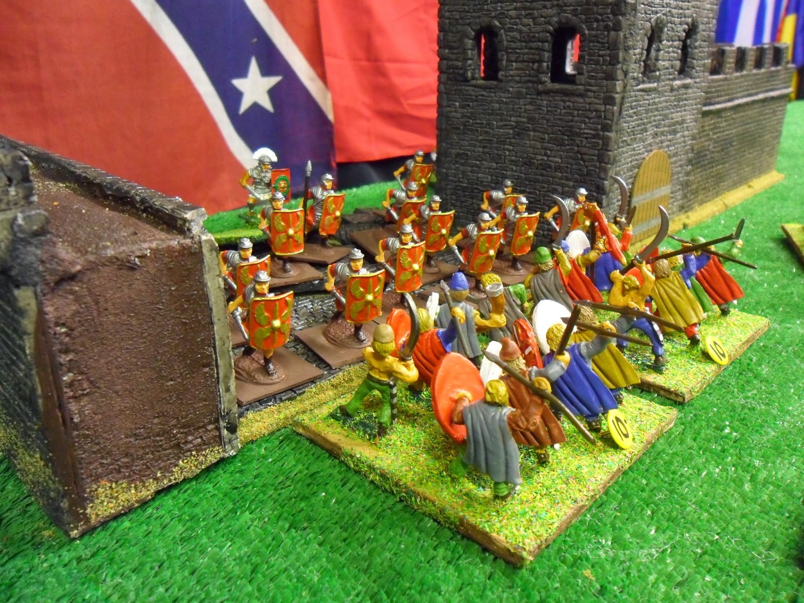 Three shots of my only real success-the fort walls have been battered down and two warbands are attacking the defending cohort-in the last photo the walls have inexplicably caught fire!!-are they made of coal??